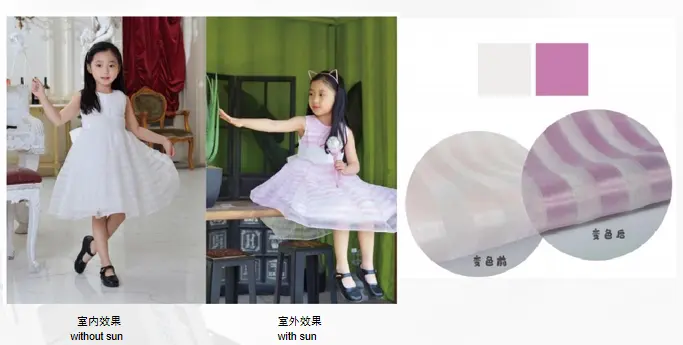ফটোক্রোমিক ম্যাটেরিয়াল হল একটি ফটোক্রোমিক পাউডার উপাদান যা বিশেষ প্রক্রিয়ার মাধ্যমে মাইক্রোক্যাপসুলে ফটোক্রোমিক রঞ্জকগুলিকে মোড়ানোর মাধ্যমে তৈরি করা হয়, যা সূর্যালোক (অতিবেগুনী) দ্বারা বিকিরণিত হওয়ার পরে সূর্যালোকের শক্তি (আল্ট্রাভায়োলেট) শোষণ করতে পারে, ফলে আণবিক গঠনে পরিবর্তন হয়, ফলে শোষণের তরঙ্গদৈর্ঘ্য পরিবর্তন হয়; সূর্যালোক (অতিবেগুনী) শক্তি হারিয়ে গেলে, এটি তার আসল আণবিক গঠনে ফিরে আসে এবং তার আসল রঙ পুনরুদ্ধার করে। বৈশিষ্ট্য: